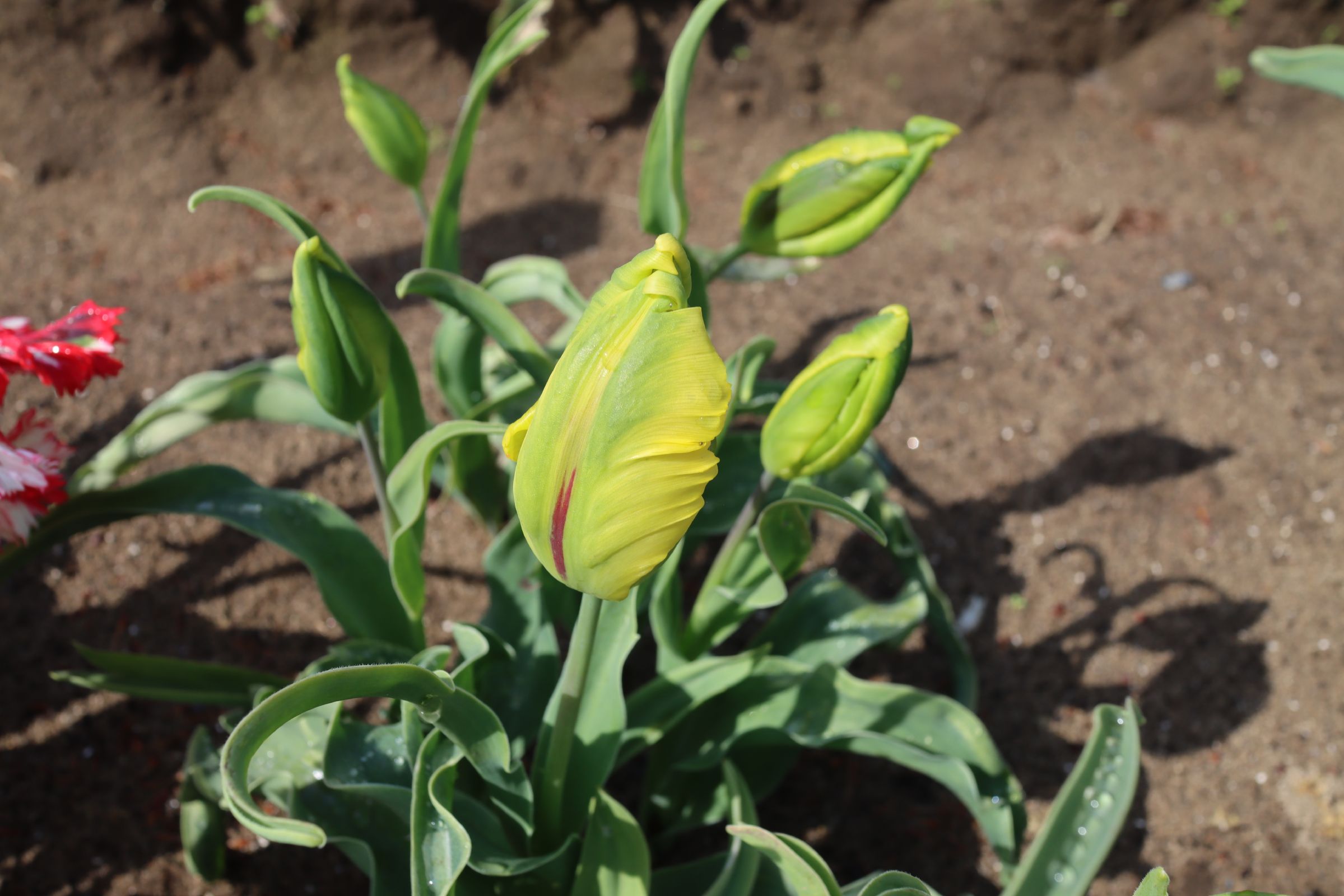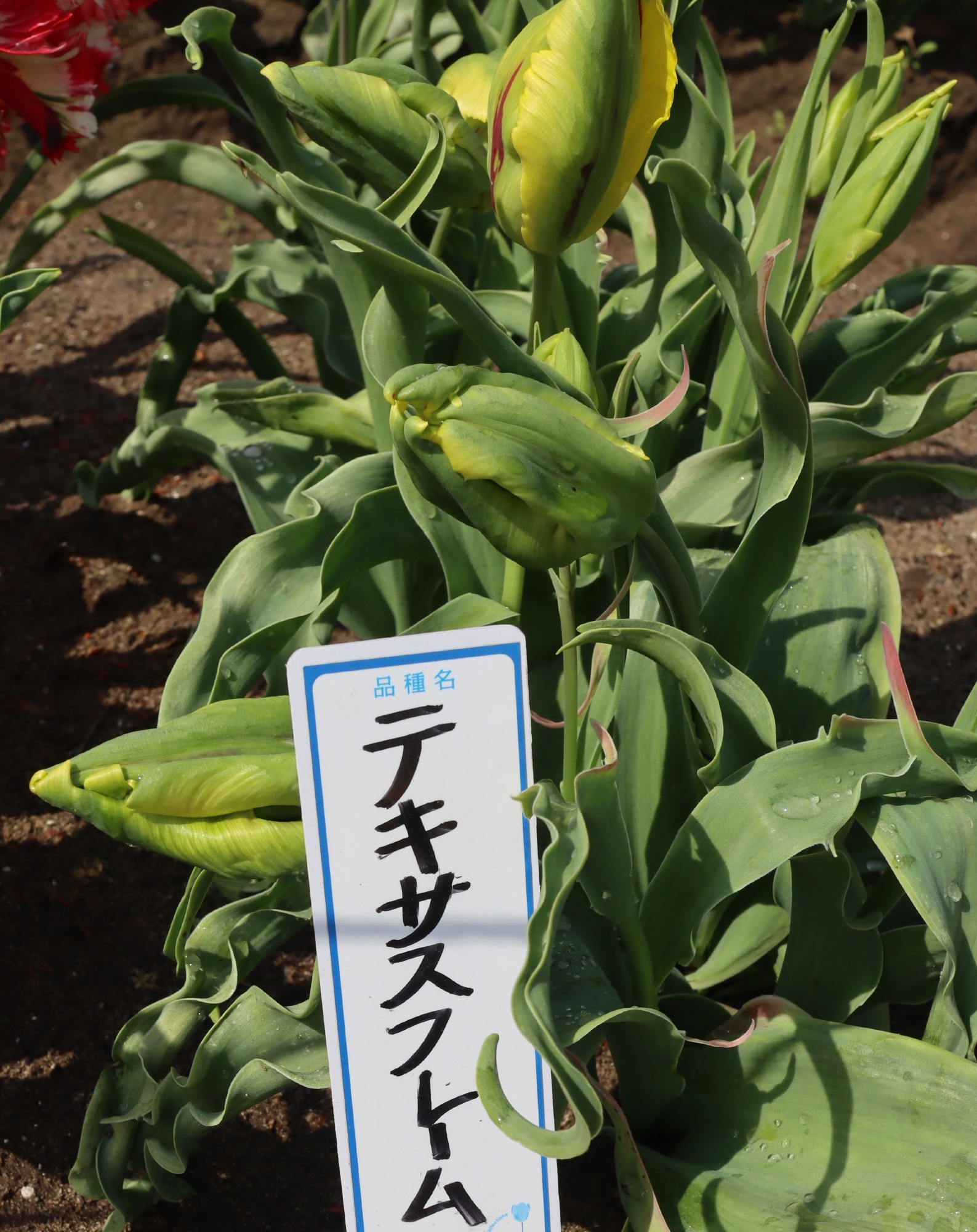 | テキサスフレーム TexasFlame ・パロット咲き系。同色系の大型なフレーミングパロットが広く普及したため市場から消えた品種 |