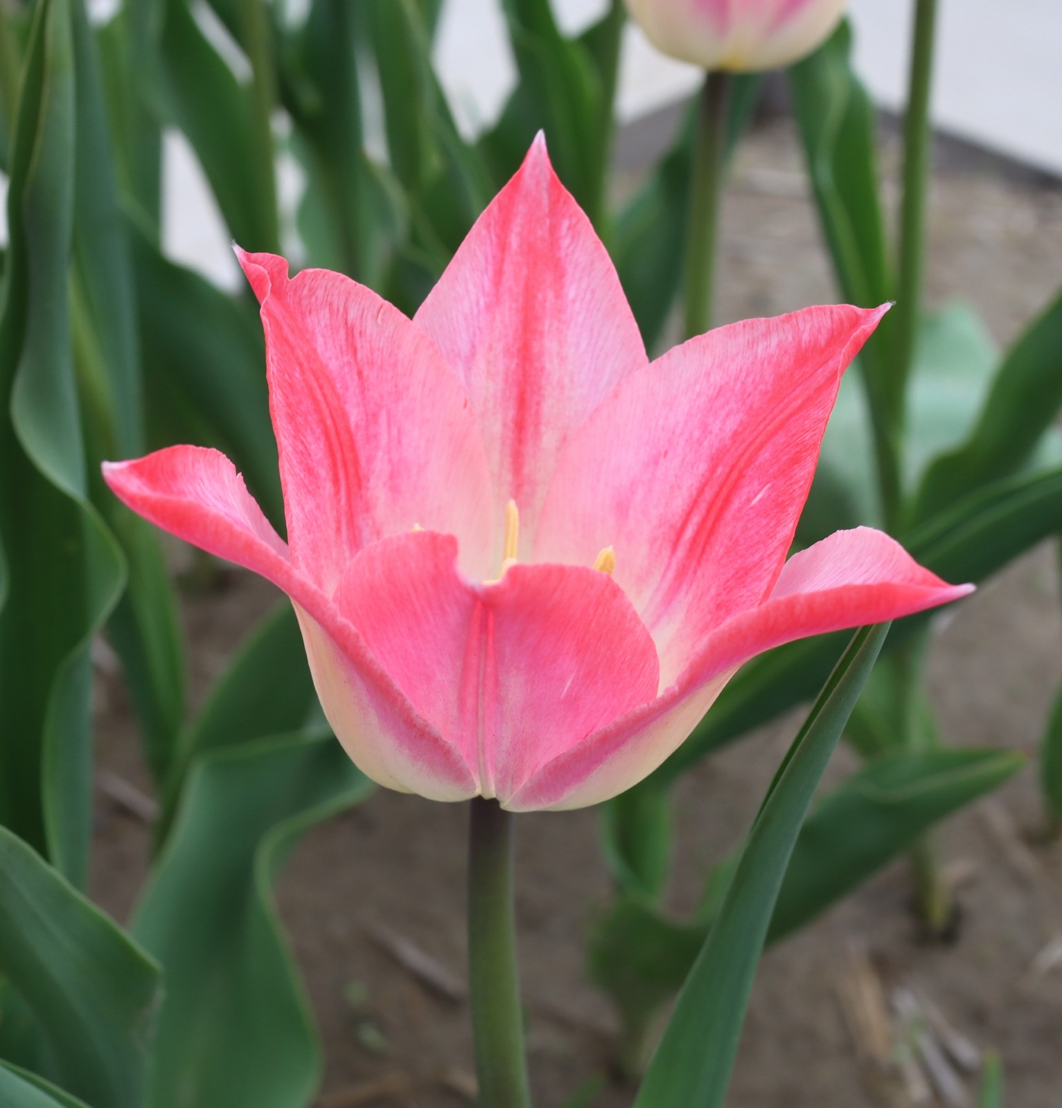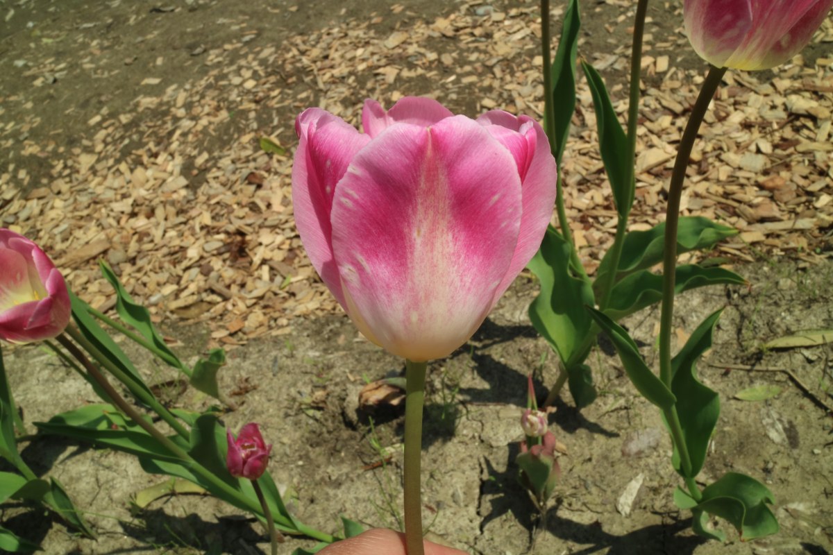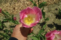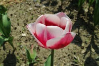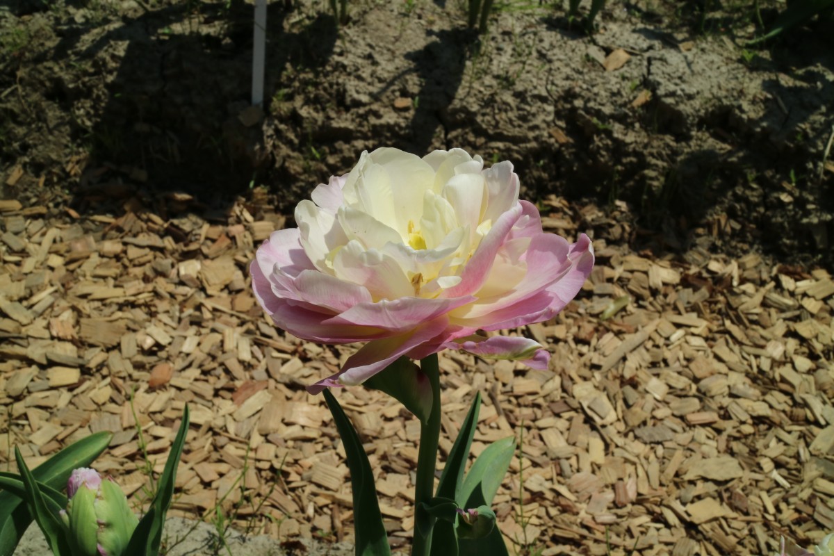 | スーパーモデル SuperModel T ・桃/白 ・medium、middle ・(ファーストチャンピオン) ・トライアンフ系。(一重咲き中生)2012年作出真っ白で咲いて徐々にピンクに染まる |